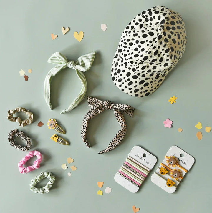 Un set adorabil de două funde lucrate manual din țesătura florală Elsie. Fiecare funda este prinsă pe o clamă tip snap îmbrăcată în panglică grosgrain roz pudrat, pentru un efect delicat și feminin.