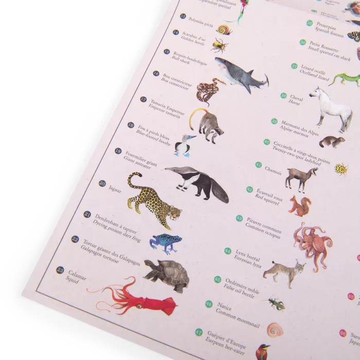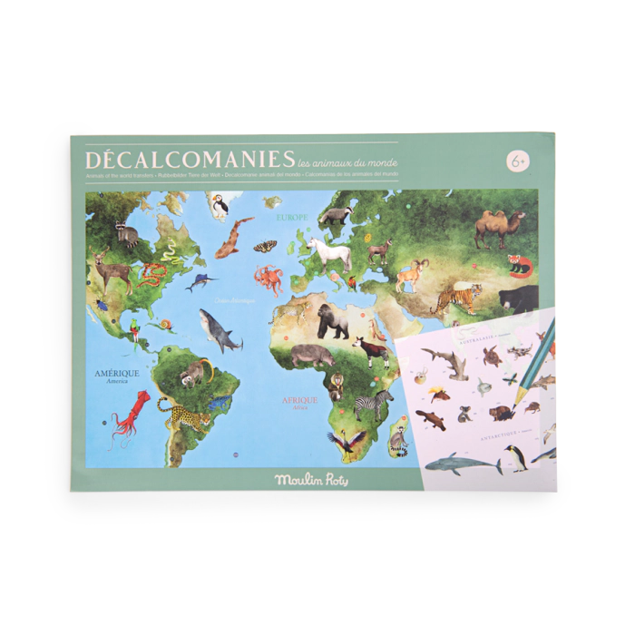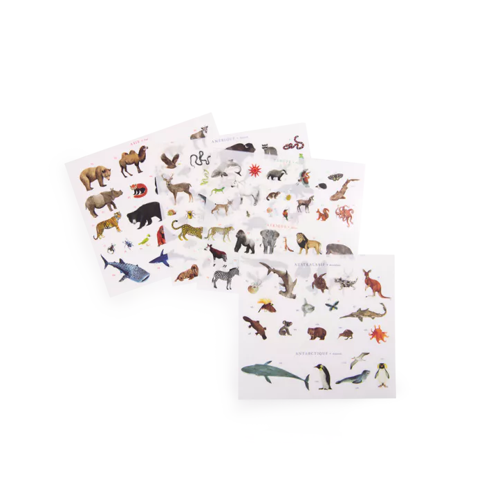 Pe ce continente trăiesc acești animale? Cu ajutorul celor 4 planșe cu decalcomanii și al posterului, așază cele 107 animale în habitatul lor natural pe harta lumii (59 x 42 cm).