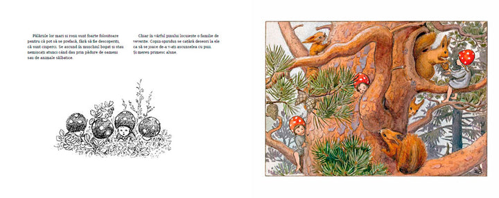 Chiar dacă nu i-a văzut nimeni până acum, în păduri trăiesc, fără îndoială, alături de zâne, și numeroase familii de spiriduși. Așa se spune în povești. Iar spiridușii, firește, au și ei copii. Ce fac ei toată ziua? Aleargă, se ascund, sar, strigă, se joacă în apă sau cu pietre și bețe — dar se duc și la școala din pădure, alături de toți puii de animale, își ajută părinții la strânsul proviziilor pentru la iarnă, se ajută între ei sau pe alte viețuitoare. După care aleargă, se ascund, sar, strigă…