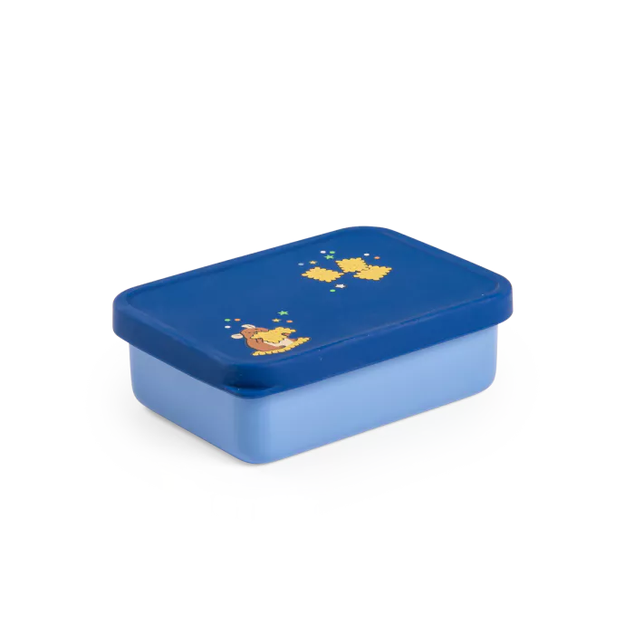 Frumoasă cutie pentru gustare, din inox cu capac din silicon, în culorile colecției Cei trei iepurași. Perfect etanșă, se strecoară cu ușurință în ghiozdanele celor mici.