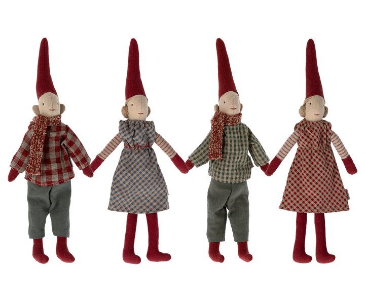 Pixies dimensiunea 1 - o colecție de 4 stiluri diferite, toate îmbrăcate în haine de Crăciun frumoase, din materiale exclusive. Sunt adorabile pentru orice decor de Crăciun și pot fi combinate și asortate între diferite mărimi și colecții.