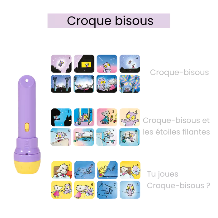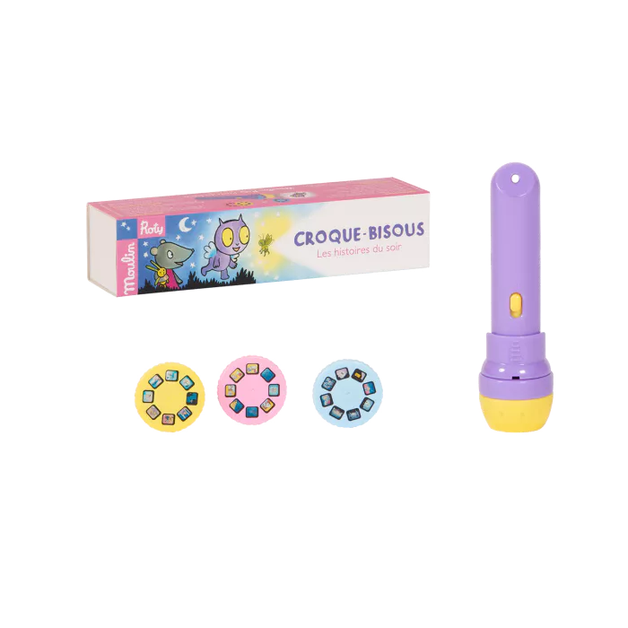 Lanternă de buzunar în care fiecare dintre cele 3 discuri proiectate pe perete spune aventurile lui Croque-Bisous, eroul colecției École des loisirs. Perfectă pentru a adormi cei mici și pentru a le stimula imaginația!