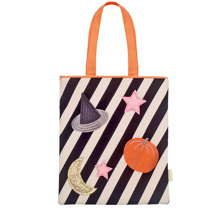 Săculețul nostru pentru Trick or Treat este realizat dintr-un material moale, în dungi, decorat cu talismane de Halloween brodate în culori vii! Căptușit complet cu material roz în dungi și prevăzut cu o toartă din același material, acest săculeț este perfect pentru colindatul de Halloween. Forma tip tote oferă suficient spațiu pentru toate dulciurile adunate!