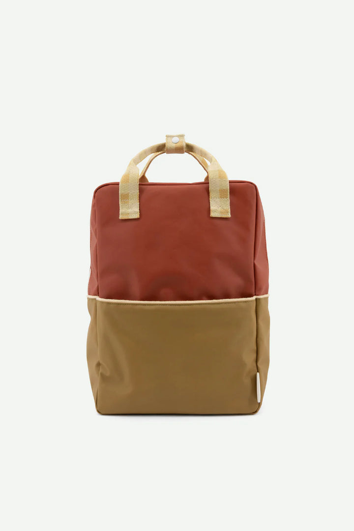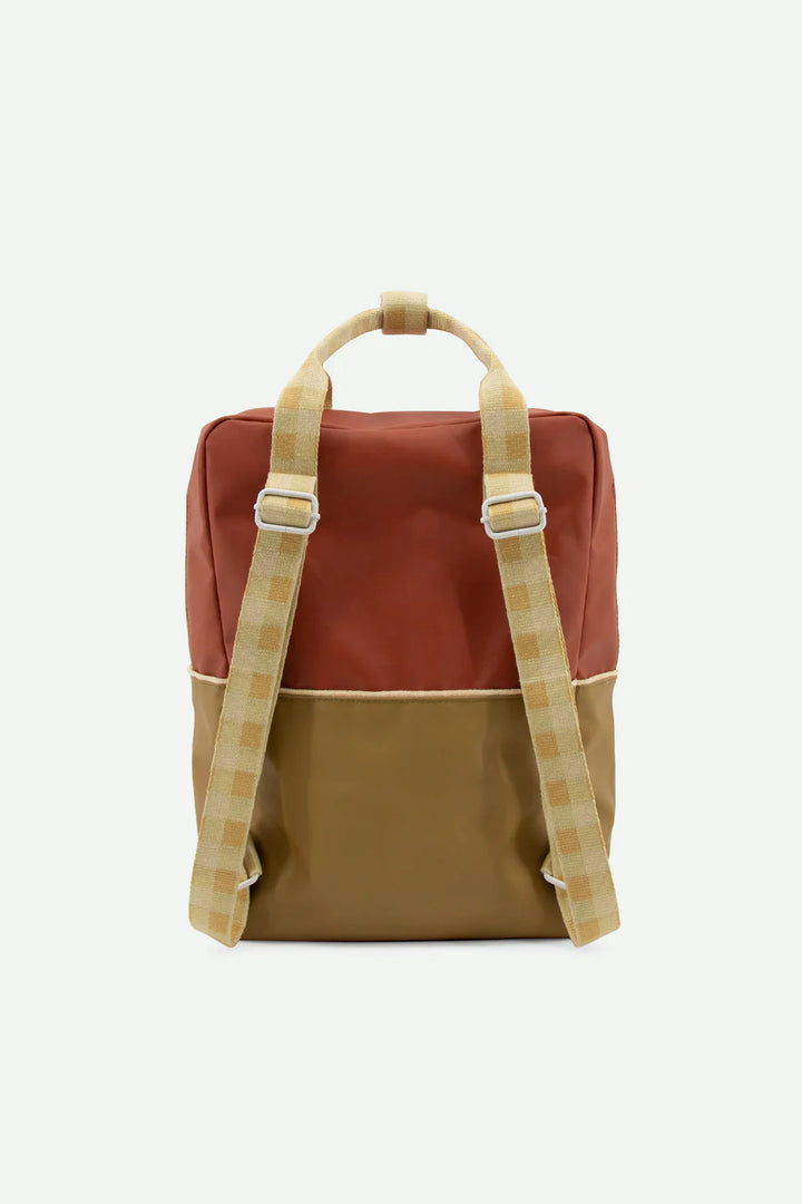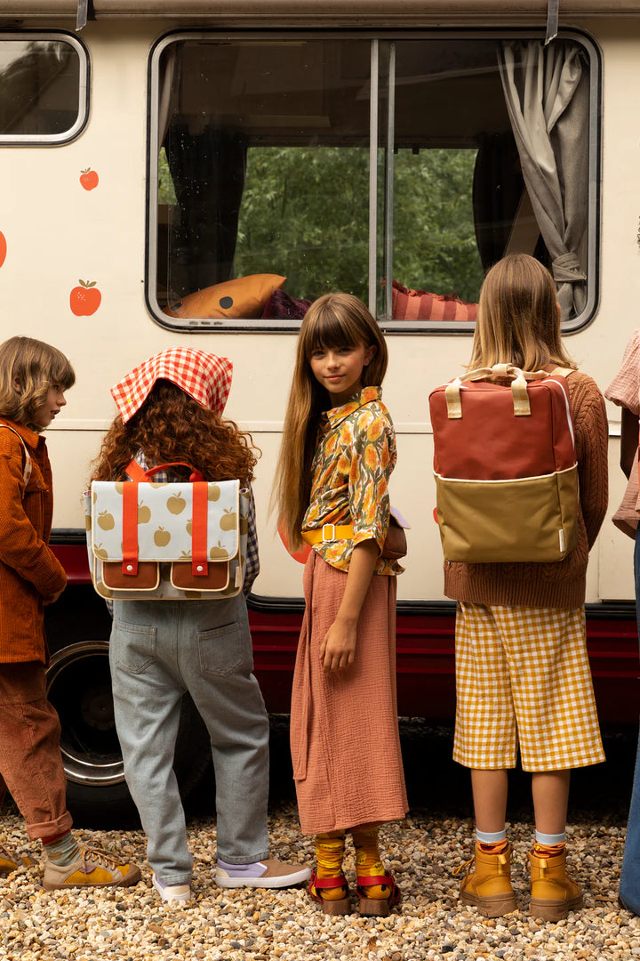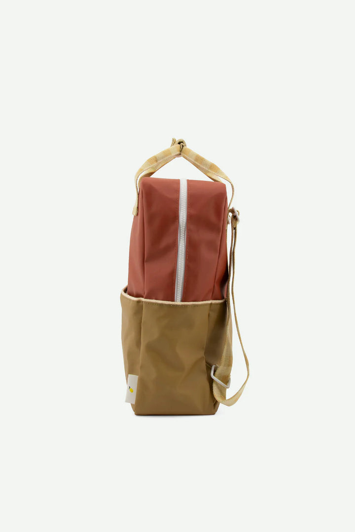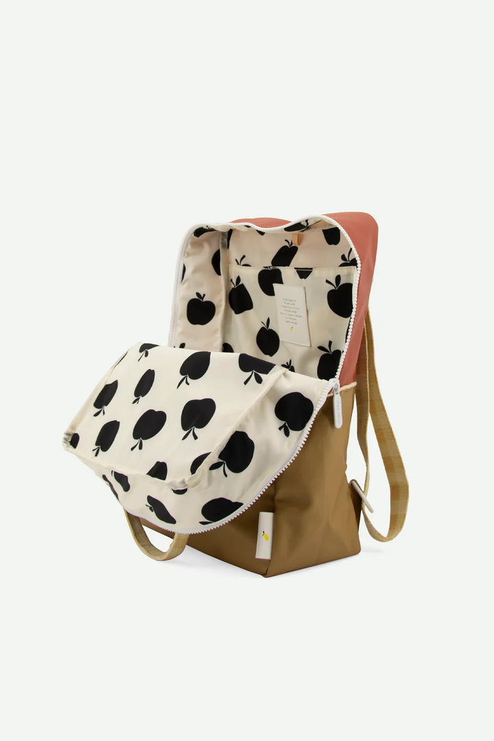 Rucsac mare în nuanțe de maro smochină, verde măr și sorbet de vanilie. Are un buzunar mic și practic în partea din față și bretele reglabile pentru umeri. Corpul este realizat din sticle PET reciclate, iar căptușeala are un imprimeu cu mere și este impermeabilă. Fermoarul este YKK. În interior vei găsi un suport elastic pentru sticlă și un buzunar pe tot spatele, care se închide cu scai (velcro).