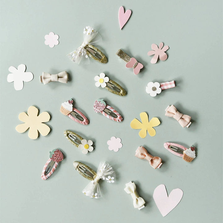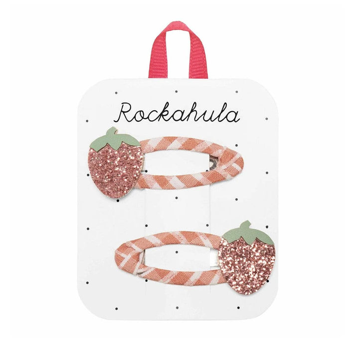 Adaugă o notă fructată și jucăușă coafurii tale cu aceste clame adorabile! Două căpșuni roz sclipitoare, cu coronițe verzi, sunt așezate pe clame tip snap îmbrăcate în panglică grosgrain roz cu model gingham.