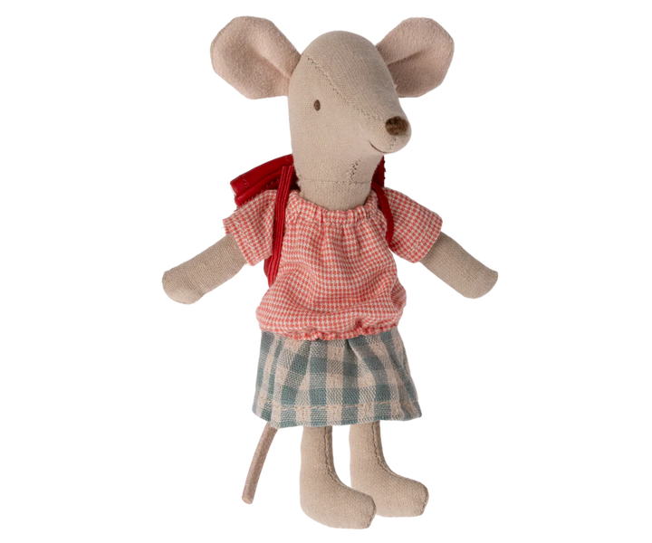 Șoricelul Soră Mai Mare este pregătit pentru o zi la școală, purtând rucsacul în spate. Are magneți în mâini, astfel încât poate ține ghidonul tricicletei pentru o plimbare rapidă.