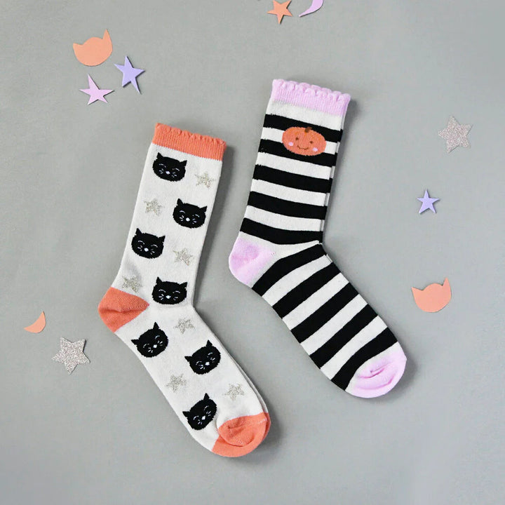 Acest set de două perechi de șosete super moi este perfect pentru sezonul de Halloween! Decorate cu dovlecei și dungi „înfricoșător de drăguțe”, șosetele sunt realizate din bumbac organic, fiind foarte confortabile pentru degetele celor mici. Pot fi asortate cu restul colecției de Halloween pentru un look complet și festiv.